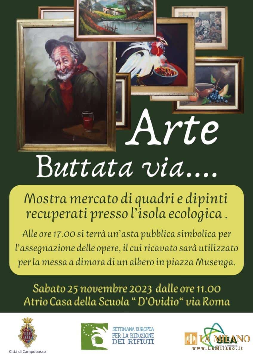 E’ l’iniziativa “Arte buttata via”, promossa dal Comune di Campobasso nell’ambito della Settimana Europea per la Riduzione dei Rifiuti, con la quale saranno messi in mostra e successivamente all’asta, una serie di dipinti, quadri, cornici, recuperati presso il Centro di Raccolta comunale della SEA di contrada Santa Maria de Foras a Campobasso e sottratti, quindi, alla discarica.