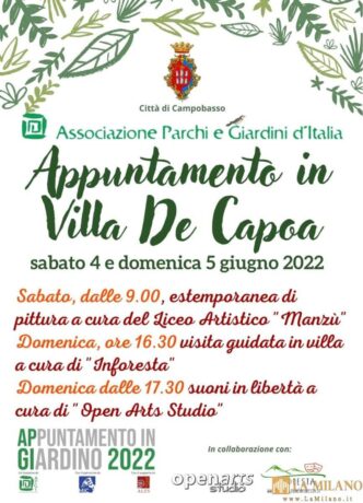 Campobasso, tornano le giornate “Appuntamento in giardino”. Sabato 4 e domenica 5 giugno, tornano le giornate “Appuntamento in giardino 2022”, evento promosso dall’Associazione Parchi e giardini d’Italia con il patrocinio del Ministero della Cultura. Il Comune di Campobasso aderisce anche quest’anno alla manifestazione, proponendo una due giorni di appuntamenti presso lo storico giardino di Villa […]